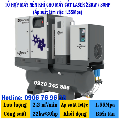 Tổ hợp máy nén khí cao áp Hande chuyên dùng cho máy cắt laser, áp suất làm việc max 16 bar. Máy nén khí cao áp Hande sử dụng đầu nén trục vít Hanbell (nhà sản xuất đầu nén lớn nhất Đài Loan). Mô tơ từ, động cơ nam châm vĩnh cửu sử dụng các bộ nguồn nhỏ hơn, tiết kiệm đến 35% so với máy nén khí thông thường). Tổ hợp máy nén khí Hande chuyên dụng cho máy cắt laser (gồm máy nén khí biến tần, máy sấy khí, bình chứa khí, máy hấp thụ và 05 bộ lọc), áp suất làm việc cao, thuận tiện trong việc di chuyển và lắp đặt.